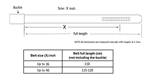 Size reference: belt size(inch)--full length(cm),Up to 36inch--110cm; Up to 40inch--115cm,120cm. Belt full length measuring from head to the tail of the belt strap. (not including the belt buckle)