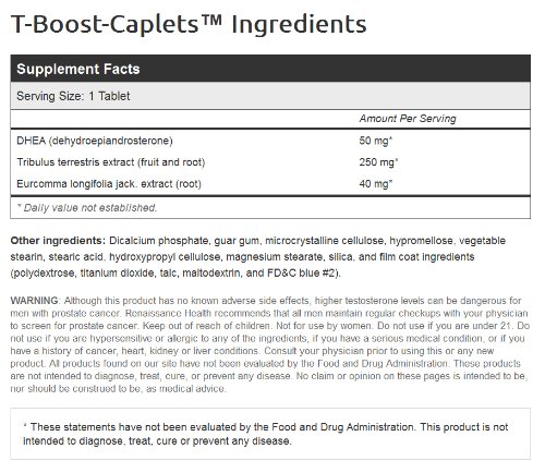 Studio : Renown Health Products LLC. Publisher : Renown Health Products LLC. Binding : Health and Beauty Product Description T-Boost contains the safest, most powerful testosterone-booster available without a prescription - dehydroepiandrosterone (DHEA). - which assists your body's own testosterone production, instead of substituting it with synthetic substances like many dangerous prescription therapies. Just one T-Boost caplet twice a day safely and NATURALLY... *Improves sex drive *Boosts exercise capacity *Restores quality of life *Reduces belly fat *Fights the blues! Don't put off taking back your life - or your Manhood - another day. 0