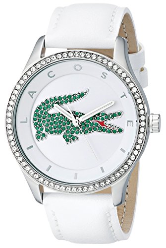 Studio : Lacoste (Movado Group Inc) Publisher : Lacoste (Movado Group Inc) Binding : Watch Product Description Stainless steel case. White leather strap with adjustable buckle closure. Three-hand analog display with quartz movement. White dial face features pave crystal logo. Dial ring features brand name and stick index hour markers. Crystal embellished bezel. Water resistant 3 ATM/30 meters. Presentation box included. Imported. 0