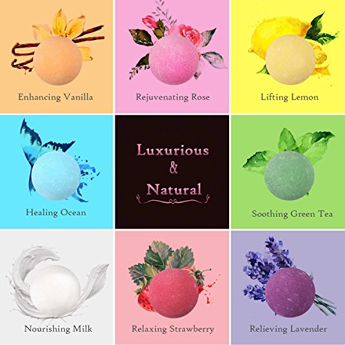 - 100% NATURAL BATH BOMBS: Benefit from fizzy bomb blended with lush organic ingredients including Rose, lemon, milk,ocean, lavender,vanilla,green tea and strawberry.