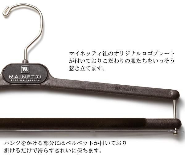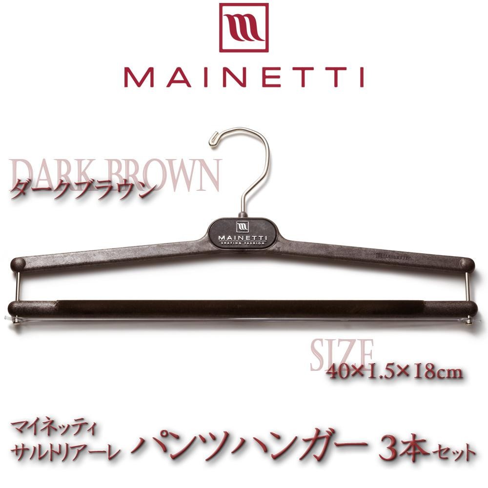 パンツ単品を掛けるのに最適なパンツハンガー。ハンガー自体が薄いのでクローゼットの中で幅を取りません。ベルベットの滑り止め付きなので折りあとを付けずに保管できます。 製造国:イタリア 素材・材質:ポリエステル樹脂 商品サイズ:1本あたり:40×1.5×18cm 重量:1本あたり:110g セット内容:3本セット ※サプライヤー直送品 ご注文後3~4営業日後の出荷となります【商品名】MAINETTI マイネッティ サルトリアーレ パンツハンガー 40×1.5×18cm 3本セット ダークブラウン PDBR3