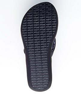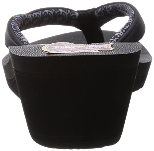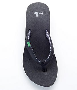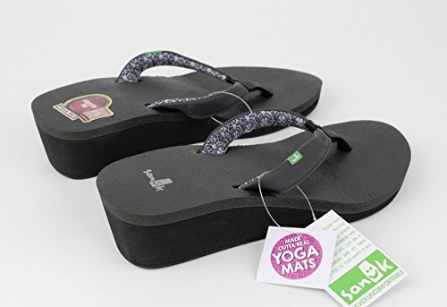 Product DescriptionKeep your feet on the mat while you're out on the town... Synthetic strap with printed jersey lining. Footbed made from real yoga mat. 2" high density EVA wedge. Happy U rubber sponge outsole.0