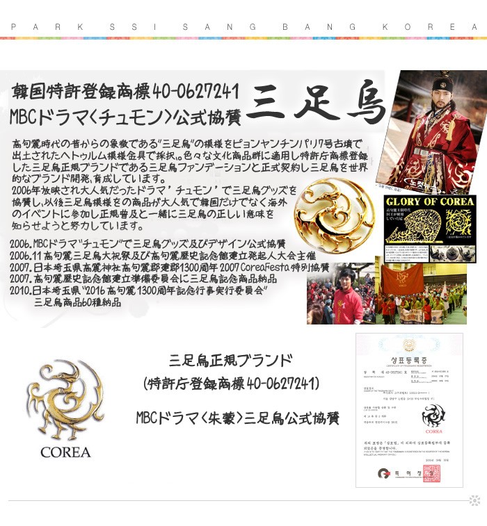 ◆◇◆三足烏(サンソクカラス)◆◇◆ドラマ朱蒙(チュモン)のオープニングに登場する三本足の烏は古代神話に出てくる、太陽の中に住むという鳥でチュモンの象徴となる鳥。中国の古典にある三足烏と呼ばれるもので、日の神=太陽をシンボル化したもの