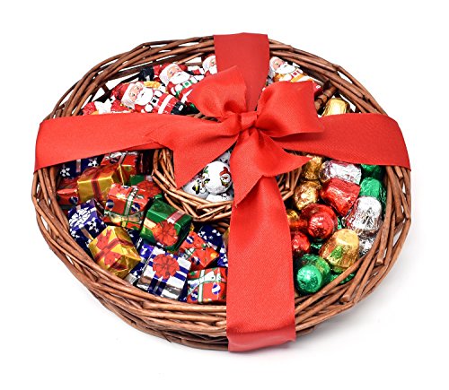 -. Title : Christmas Wicker Gift Basket with Milk Chocolate Christmas Bells, Mini Santas, Christmas snowballs and Mini Christmas presents - Assorted Premium Christmas Madelaine Chocolates, 1.5 Lbs (681g)