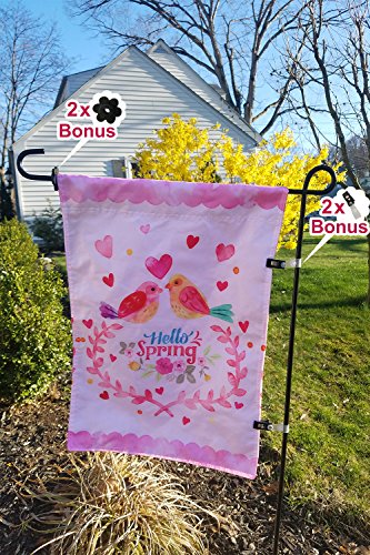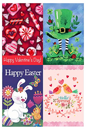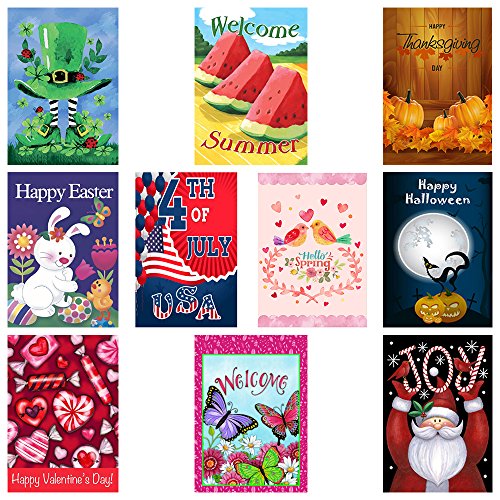 -. Feature : PREMIUM DECORATIVE FLAGS SET FOR YEAR-ROUND USE - Enjoy your garden every day of the year. Our flags set will add a beautiful and distinctive welcoming touch to your home and garden decor with designs visible from all sides (unlike other competitor's products that have 1 sided designs) / PERK UP YOUR GARDEN DÉCOR and get your neighbors and guests admiration with our charming flags designs. Set includes 10, 12x18in flags to celebrate each season and important holidays - Valentine's, St Patrick's Day, Easter, SP.R.Ing, Summer, July 4th Independence Day, Halloween, Thanksgiving, Holiday and a year-round Welcome Flag / WEATHER RESISTANT MATERIAL (3 LAYERS), DURABLE - flags are made out of high quality double sided polyester. UV and fade resistant they are perfect for the outdoors, all seasons. Double stitching around the sides for long lasting flags. Design is clear on both sides, a middle blackout layer ensures full design clarity from all sides / BONUS FLAG STOPPERS (2) and ANTI WIND CLIPS (2), EASY INSTALLATION - flags feature sleeve at top, simply slip in the flag on the pole. Use the included bonus flag stoppers and anti-wind clips to keep them in place during windy days. Will fit most standard mini flag poles / SATISFACTION GUARANTEED - Your satisfaction is our P.R.Iority. Buy with confidence, we will provide a full refund for any issues