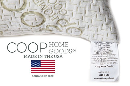 - Feature : NOTE: PLEASE CHECK "SOLD BY" SELLER NAME, only Coop Home Goods products SOLD BY Marlow's Mercantile ARE GUARANTEED GENUINE. If you order from a different seller and pillows are not made in the USA, don't have Coop Home Goods embroidered on the fabric, or Coop Home Goods on the Law Label please contact Amazon and us immediately. / MADE IN THE USA with 100% U.S. Made CertiPur-US Certified Foam. HYPOALLERGENIC & DUST MITE RESISTANT - allergy sufferers no longer need to compromise comfort! / MACHINE WASHABLE - 5 Year Warranty - Guaranteed it will not go flat. / PROPRIETARY SHREDDED VISCO ELASTIC MEMORY FOAM- Custom mold your pillow to your needs - for all sleep positions. Allows greater ventilation - Promotes proper alignment allowing deeper sleep through the night. / BACKED BY THE COOP HOME GOODS GUARANTEE - We guarantee you'll love the pillow, and if you aren't absolutely satisfied, return it within 30 days for a full refund, no questions asked.