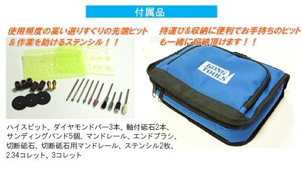 | 付属品 | ハイスビット、ダイヤモンドバー3本、軸付砥石2本、サンディングバンド5個、マンドレール、エンドブラシ、切断砥石、切断砥石用マンドレール、ステンシル2枚、2.34コレット、3コレット、カバン、取扱説明書 |