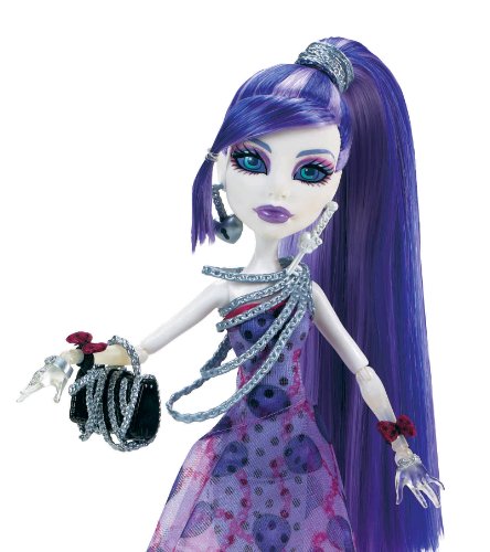 What's a high school party without a theme? This year, Monster High® students selected polka dots, and they're getting glammed up for the party to look Dot-Dead GorgeousTM! This Monster High Spectra VondergeistTM Party Doll looks hauntingly beautiful in a purple one-shoulder mini-dress with black polka dots and pink trim. Chains on her bodice, a chain-print purse and "silver" jewelry complete her to-die-for outfit. It's time to polkadot! Doll cannot stand alone. Ages 6 and older.Feature
