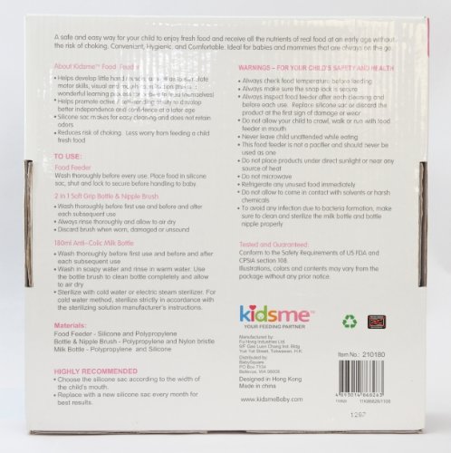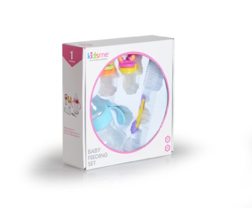 -. Binding : Baby Product -. Brand : Kidsme -. EAN : 4893014868263 -. Feature : Contains two Kidsme Food Feeders (1 small and 1 large), a 6oz anti-colic bottle, multi-purpose brush. / BPA free and FDA tested. Ideal for 4+ months and up. Top-rack dishwasher safe. / Allow your child to eat fresh food without the risk of choking. Unique patent design, improved from traditional mesh bag feeders. Silicone sac makes for easy cleaning, does not retain odors, encourages chewing, more natural and comfortable to the baby. Designed with textured silicone surface works best with frozen fruit or ice cube to soothe teething pain and massage baby's gum. / Specially designed bottle to reduce infant colic by keeping air out with the anti-colic valve. / Multi-purpose brush for bottles, cups, dishes as well as smaller size utensils. -. Label : Kidsme -. Manufacturer : Kidsme -. MPN : 210180 -. PartNumber : 210180 -. ProductGroup : Baby Product -. ProductTypeName : BABY_PRODUCT -. Publisher : Kidsme -. Studio : Kidsme -. Title : Kidsme Weaning Set - 4 ct
