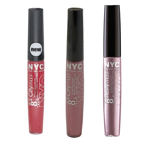 N.Y.C. 8 Hour City Proof Extended Wear Lip Gloss, Ruby Pink, Freeze Mauve and Lilac with Dimple Bracelet