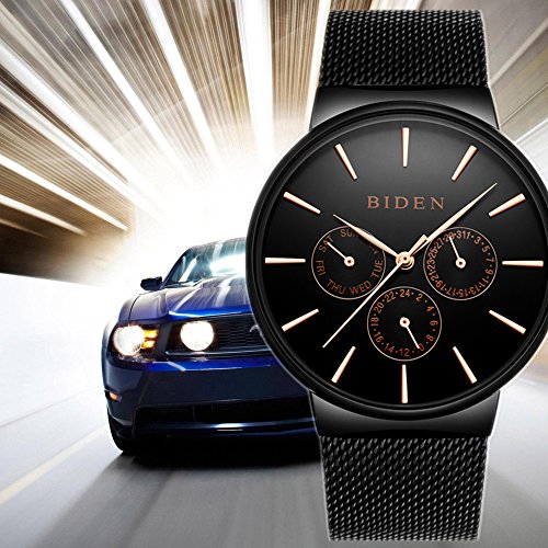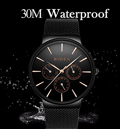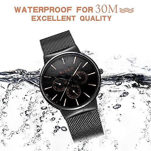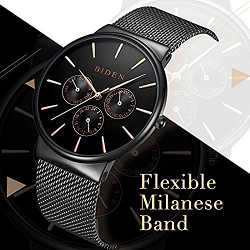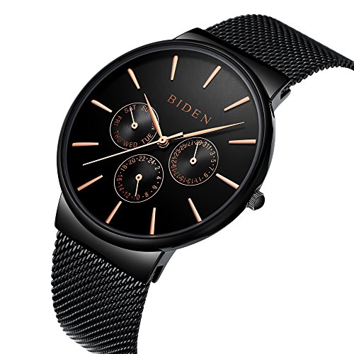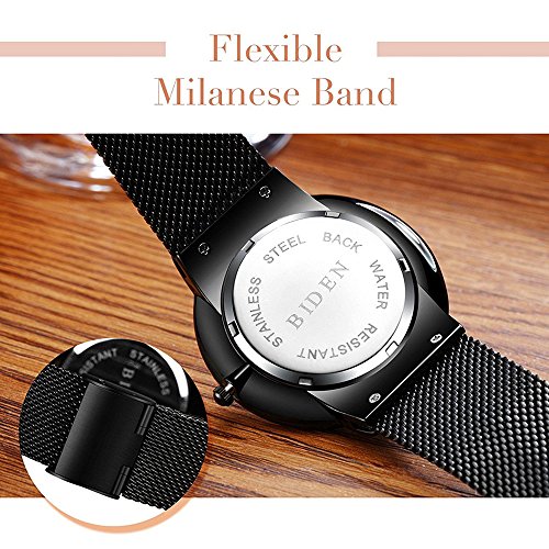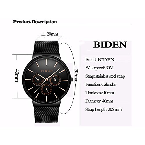Brand, Seller, or Collection Name:BIDEN Model number:BD006-Allblack Part Number:4331784883 Item Shape:Round Dial window material type:Hardlex Display Type:Analog Clasp:Hook Buckle Case material:Stainless steel Case diameter:4 centimeters Case Thickness:0.70 centimeters Band Material:mesh Band length:Men's Standard Band width:2 centimeters Band Color:Black Dial color:Black Calendar:Day, date, and month Special features:Backup battery Movement:Analog quartz Water resistant depth:98 Feet
