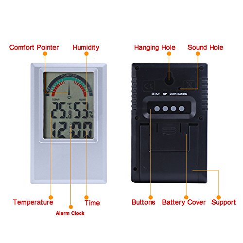 EWTTO Temperature and Humidity Electronic Meter, Wall & Desktop Alarm Clock with LCD Display Max/Min Humidity Thermometer Memory (Silver)