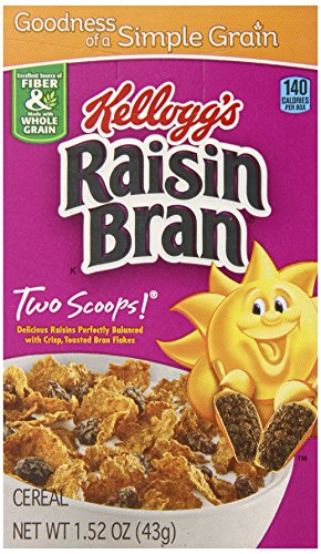 -. Feature : Pack of 70, 1.52-ounce single-serving boxes of Kellogg's Raisin Bran Cereal / Made with whole grain wheat, wheat bran, and all-natural raisins / Healthy breakfast cereal that the whole family will love / 7-grams of fiber per 190-calorie serving; 13 essential vitamins and minerals / Comes in convenient single serving boxes for eating on the go