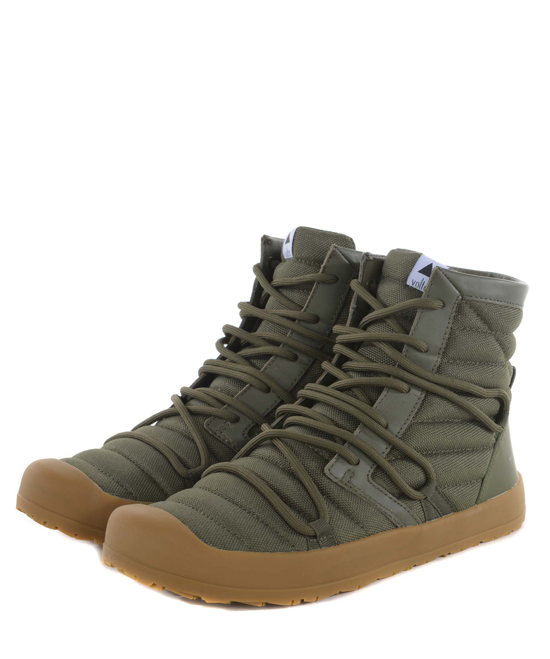 Sneakers Volta in nylon imbottito Verde militare. Collo alto. Profili in pelle. Stringate. Inserto in gomma sul retro. Patch logo sulla linguetta. Coppia di stringhe bicolore in dotazione. Puntale in gomma. Suola in gomma. Misura in foto 40