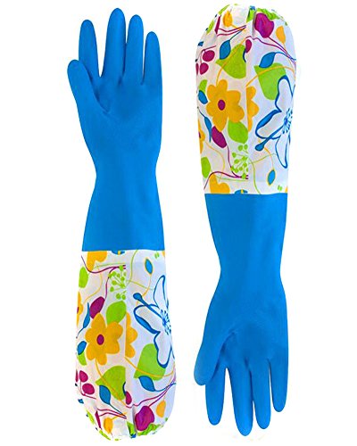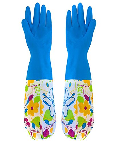 BESTCYC Blue Long Reusable Flower Velveteen Antiskid Household Laundry Dishwashing Waterproof Latex Rubber Gloves