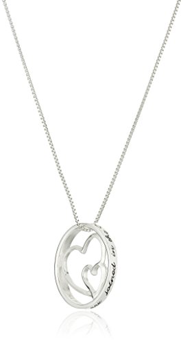 Sterling silver necklace featuring open disc pendant with two hearts in center and circumference engraved with "Mothers and Daughters are Joined in the Heart"