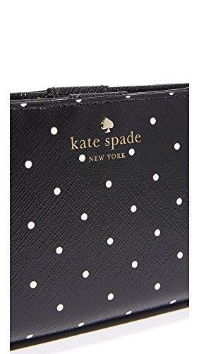 A Kate Spade New York wallet in polka-dot, saffiano leather. Logo lettering accents the front, and a zip pocket details the back. A snap closure opens to an interior with 4 cash pockets, 12 card slots, and an ID window.
