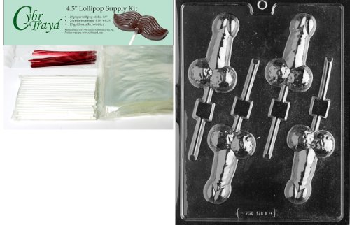 Cybrtrayd 45StK25R-XX511 Medium Pecker Pop Adult Chocolate Candy Mold with Lollipop Supply Bundle, Includes 25 Lollipop Sticks, 25 Cello Bags and 25 Red Twist Ties