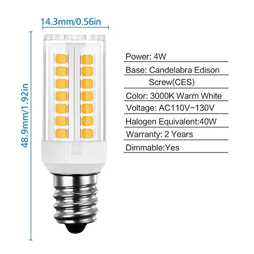 WHAT YOU GET: Pack of 6 units 4W dimmable E12 LED bulb, warm white 3000K, bright without glare. Please check if the dimension can fit your light fixture