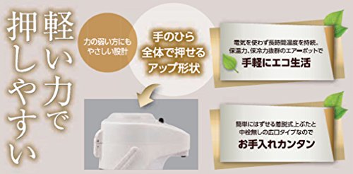 材質:本体内側/18-8ステンレス鋼、本体外側/ステンレス鋼、ふた/ポリプロピレン(耐熱温度100度)・ABS樹脂(耐熱温度80度)、口がね・ハンドル・中栓・注ぎ口/ポリプロピレン(耐熱温度100度)、プッシュボタン/ABS樹脂(耐熱温度80度)、開閉レバー/ABS樹脂(クロムめっき・耐熱温度80度)、揚水パイプ/ステンレス鋼、パッキン/シリコーンゴム(耐熱温度180度)