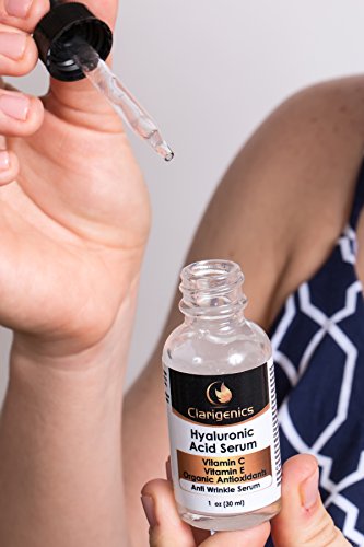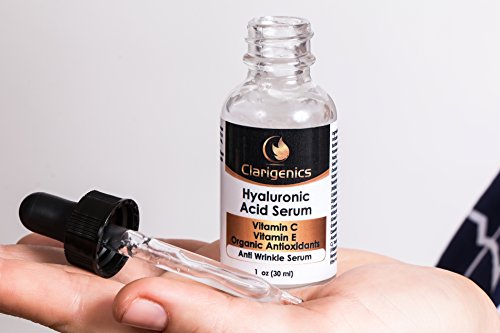 -. Binding : Misc. -. Brand : Clarigenics -. EAN : 0820103905626 -. Feature : ARE YOU DOING ENOUGH TO STOP DEEP WRINKLES FROM FORMING? The key to locking in youth is to lock in moisture! Hyaluronic acid binds 1,000 times its own weight in water deep into the spaces between skin cells. Our customers say they notice IMMEDIATE RESULTS and report smoother, softer, and more radiant skin after just one application of the best hyaluronic acid serum on the market. / DID YOU KNOW MOST SIGNS OF AGING ARE REVERSIBLE? You can roll back the clock and look ten years younger with the best wrinkle serum made today. Combining hyaluronic acid and vitamin C + E, this wrinkle repair serum plumps the skin and makes fine lines and wrinkles fade. Fills in crows feet, lip wrinkles, deep smile lines around the mouth, neck creases, and even those stubborn forehead wrinkles! / 98% NATURAL AND 72% ORGANIC - Our best anti wrinkle serum is a hypoallergenic blend of rejuvenating ingredients that infuse the skin with a vegan hyaluronic acid moisturizer base (locks in water), Vitamin C (reverses sun damage), Jojoba Oil (anti-bacterial moisturizer), Witch Hazel (blemish fighter), Vitamin E (repairs cellular damage), Green Tea (neutralizes free radicals), and Aloe (heals and soothes stressed skin). / BEAUTY WITHOUT COMPROMISE - Our stunning skin care results come from the potency of natural botanical active ingredients. That's why our hyaluronic serum for face and hands is paraben free, and uses no dioxanes, phthalates, SLS, alcohol, or other toxic ingredients. We make this hyaluronic acid for face in the USA in our FDA and GMP certified facility. And we love animals, so of course we're cruelty free! / TRY IT NOW, WORRY FREE, FULL 365 DAY GUARANTEE - The best guarantee in the business. See results or get your money back, no questions asked. Simple and honest. -. Label : Clarigenics -. Manufacturer : Clarigenics -. Model : Hyaluronic Acid Serum Anti Wrinkle Serum -. MPN : Hyaluronic Acid Serum Anti Wrinkle Serum -. PackageQuantity : 1 -. PartNumber : Hyaluronic Acid Serum Anti Wrinkle Serum -. ProductGroup : Beauty -. ProductTypeName : BEAUTY -. Publisher : Clarigenics -. Size : 1 oz -. Studio : Clarigenics -. Title : BEST Hyaluronic Acid and Vitamin C Anti Wrinkle Serum for Face - Repairs Deep Wrinkles Faster Than Wrinkle Cream By Locking in Moisture for Lasting Youth - With Aloe, Green Tea, Organic Antioxidants -. UPC : 820103905626