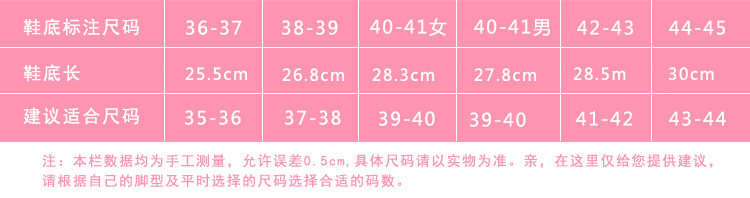 尺寸:女款36-41码,男款40-45码(脚肥的亲建议拍大一码喔~)