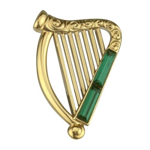 -. Feature : A beautiful 18K gold plated Irish harp brooch with green crystals. / Measures approximately 7/8" wide and 1 3/8" tall. / The harp is the traditional instrument of Ireland. / Comes gift boxed by Solvar in Co. Dublin, Ireland.