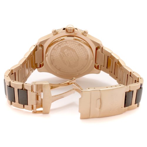 - Feature : Swiss Quartz movement / Flame-fusion crystal; Brushed and polished 18k rose gold ion-plated stainless steel case and bracelet with textured gunmetal center links / Chronograph functions with 60 second, 30 minute and day of the week subdials outlined in rose gold tone; Date function / Black dial with rose gold tone hands and hour markers; Luminous; Black unidirectional bezel with white engraved arabic numerals; tachymeter scale on inner bezel / Water-resistant to 330 feet (100 M)