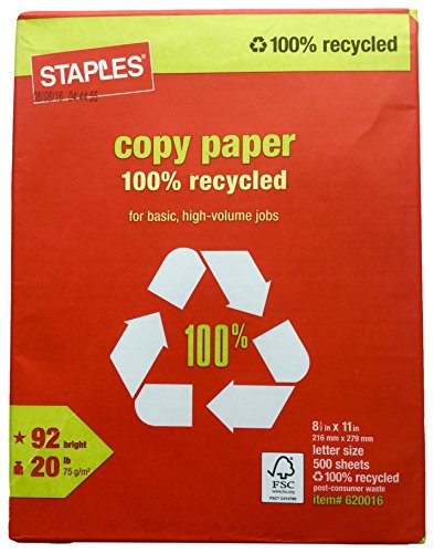 Staples 100% Recycled Copy Fax Laser Inkjet Printer Paper, 500 Sheets, Bright White