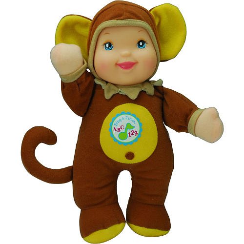 This 11 inch baby will sing her ABCs and count from 1 to 10 when you press her tummy! Sing and Learn babies help to teach letters A to Z and numbers 1 to 10, promote eye and hand coordination, teach cause and effect, develop motor skills, stimulate and develop the senses of hearing, touch and sight. Dressed in adorable animal outfits includiing bunny, duck, frog or cow. Machine washable (when the module is removed). Includes the Goldberger Lifetime Guarantee! Batteries are included.
