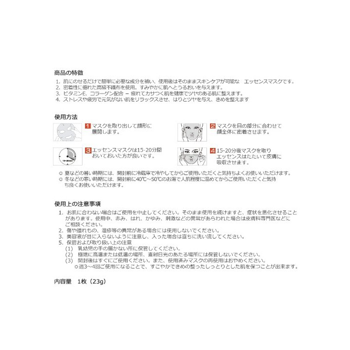 피부에 얹는 것 뿐(만,만큼)으로 간단하게 필요한 성분을 보충하고, 사용 후는 그대로 스킨 케어가 가능한 에센스 마스크입니다.
