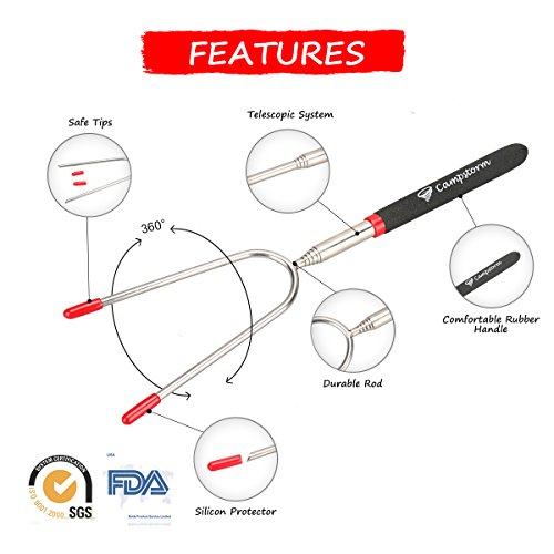 - ▶PREMIUM QUALITY & WELL CONSTRUCTED: Non-Toxic stainless steel retractable hot dog sticks Without Any Coating Added, the Telescopic Rods are Flexible and Smoothly Precise Processing, also extremely sturdy with colored Dual layer assembled Anti-skidding & Heat-insulated rubber hand grip; enjoying your roasting fun to the full with this set of Campfire sticks.