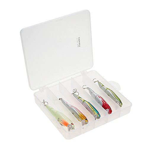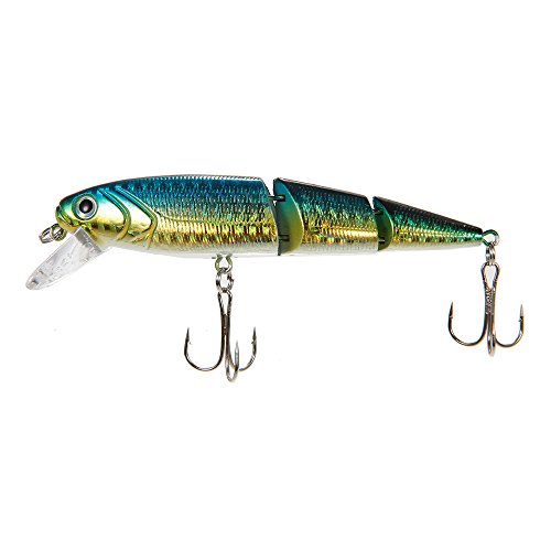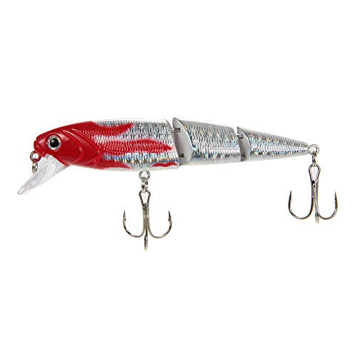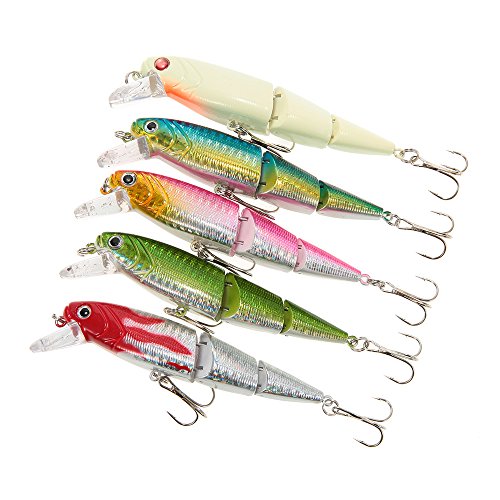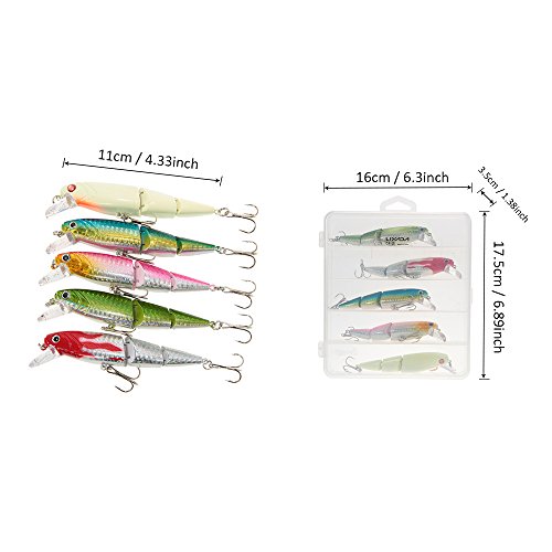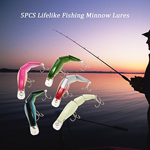 -. Feature : 11cm 3-segments fishing lures. 3D lifelike eyes. / Strong piercing treble hooks. High resolution body details. / Smooth and rapid diving action. Lifelike swimming actions in water to provoke predator to bite. / With high penetration steel treble hooks to catch more fish. / 5pcs minnow fishing lures packed in free tackle box.