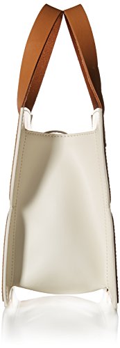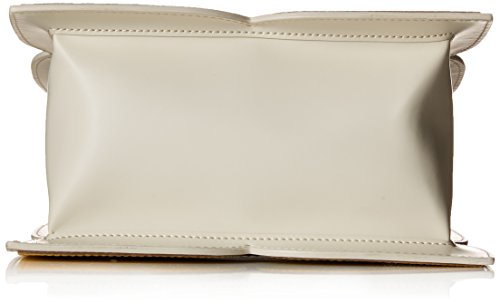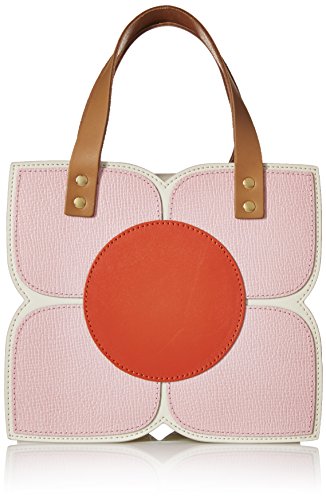 Square flower applique structured handbag. Two short handles in contrast leather. Vinyl flap and popper to close. Inside details include linear stem jacquard lining and two slip pockets, pocket with zip closure and elastic key chain.
