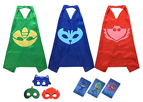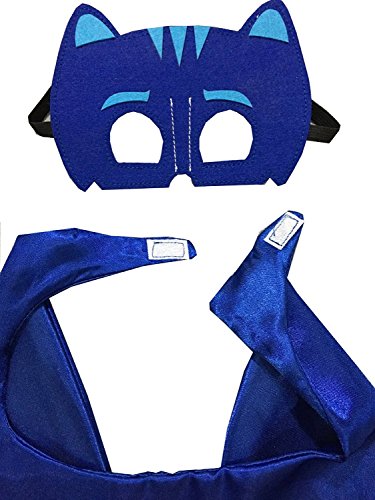 -. Brand : Qian -. Color : BLUE -. EAN : 4974326272105 -. Feature : PJ Masks Costumes For Kids Set of 3 / Each set contained with Mask and Cape (Sizes 27.5 inches) / Highly Recommended for Boy Gift for Costume playing PJ Mask Hero / Get all Character Catboy Owlette and Gekko / Safe Material from Rayon, Spandex -. Label : Qian -. Manufacturer : Qian -. ProductGroup : Apparel -. ProductTypeName : CHILDRENS_COSTUME -. Publisher : Qian -. Size : 27.5inch -. Studio : Qian -. Title : PJ Masks Costumes For Kids Set of 3 Catboy Owlette Gekko Mask with Cape (27.5 inches)