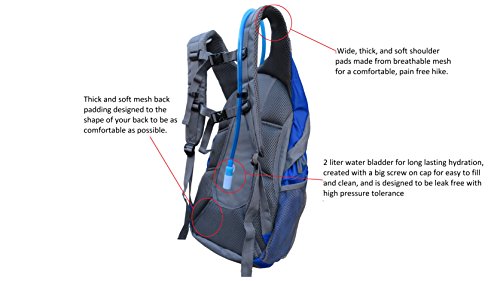 -. Feature : EXTREMELY COMFORTABLE: This hydration backpack is created with our signature design, two buckles attached to the shoulder strap, one across the chest and one across the stomach releasing pressure off the shoulders and back. Additionally has a thick mesh padding and back support system formed to your back to give you the most comfortable hike possible.. / PERFECT FIT: Adjustable straps to fit perfectly for both men and women: Shoulder straps can tighten and loosen, Buckle straps can tighten and loosen, as well as move up and down. / DAY-HIKE+ VOLUME: 30l hydration backpack has two large compartments and one small compartment. Two side mesh pockets for easy visibility and easy access. / BREATHABLE: Hydration pack is made with thick mesh shoulder and back padding to allow your body to breathe and be comfortable at the same time. / GUARANTEED and DURABLE: We are so confident of the quality of our hiking pack that we offer a 2 Year limited warranty!