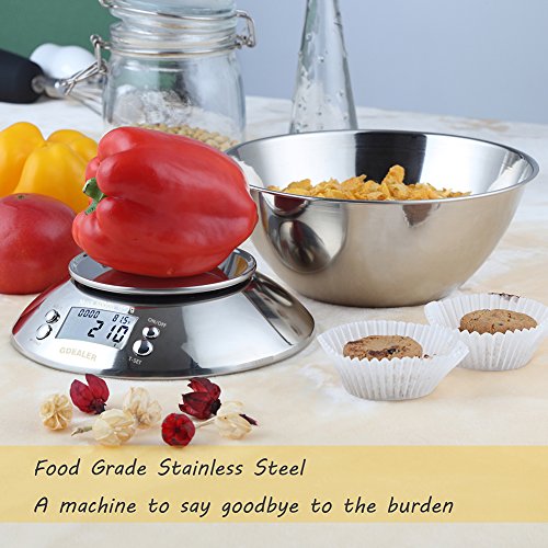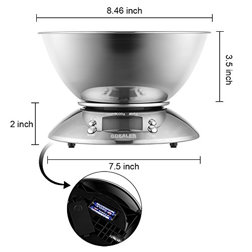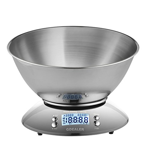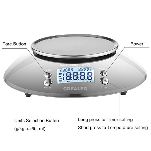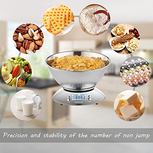 GDEALER Digital Kitchen Scale 11lb/5kg Accuracy Food Scale Multifunction Kitchen Scale with Bowl, Stainless Steel, 2.15L Liquid Volume, Alarm Timer, Temperature, Backlight LCD Display