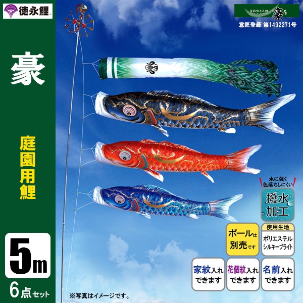 こいのぼり/鯉のぼり 庭園用(ポール別売りになります)(家紋入れ・名前入りは別料金になります)鯉のぼり 室内用 鯉のぼり ポール 鯉のぼり マンション 鯉のぼり 庭 園用 鯉のぼり 手作り 久月鯉のぼり 鯉のぼり ポール 鯉のぼり 徳永 取扱(セット内容)・吹流し5m・黒鯉5m・赤鯉4m・青鯉3m・矢車一式・ロープ25m金彩弦月之鯉 豪 伝統の捺染技法によるぼかし染めをし、色鮮やかに仕上げております。鯉のぼりには豪華絢爛なアルミ金箔を用い、雲の隙間に光輝く弦月を描くことで、力強さとスケースの大きさを表現しています。吹流しは深緑を基調とした色に、端午の節句にゆかりの深い[菖蒲丸柄]を散りばめることでお子様の誕生祝い、健やかな成長を願うという意味が込められています。生地は軽くて丈夫なポリエステルシルキーブライト生地を使用。また、鯉のぼり・吹流し共に雨水に強い撥水加工を施した豪華な仕様となっています。