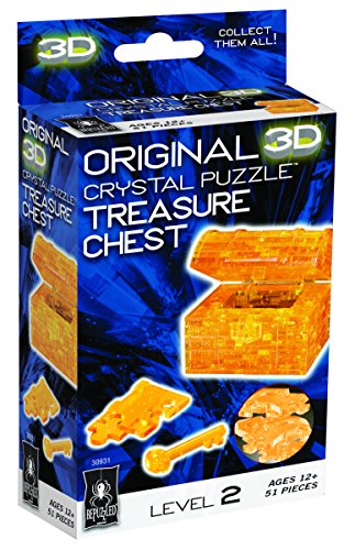-. Binding : Toy -. Brand : Bepuzzled -. Department : Math & Word Games -. EAN : 6578017569437 -. Feature : The Gold Treasure Chest 3D Crystal Puzzle from BePuzzled is a sleek, translucent puzzle with 52 unique interlocking crystalline pieces, including key / Take puzzling to a whole new dimension with this stunning, yet functional crystal puzzle / Enjoyable to work on, challenging to complete and beautiful to display / This 3D puzzle has a difficulty level of 2 and is fun for puzzlers age 12 and up / Approximate assembled size = 3-1/8" x 2-3/8" x 2-1/2", 4" open -. IsAdultProduct : 0 -. ItemPartNumber : 30931 -. Label : University Games -. Manufacturer : University Games -. Model : 30931 -. MPN : 30931 -. NumberOfItems : 1 -. PackageQuantity : 1 -. PartNumber : 30931 -. ProductGroup : Toy -. ProductTypeName : TOYS_AND_GAMES -. Publisher : University Games -. Studio : University Games -. Title : Original 3D Crystal Puzzle - Treasure Chest Gold -. UPC : 658108602659 -. Warranty : No Warranty