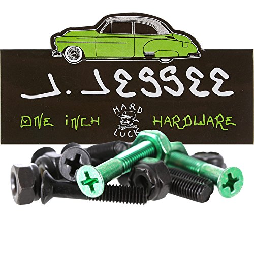 Studio : Hard Luck MFG Publisher : Hard Luck MFG Binding : Misc. Product Description This brand new set of Hard Luck MFG 1" mounting hardware includes eight (8) bolts and eight (8) matching lock nuts in Black / Green. Hard Luck MFG Phillips Head Jessee Standard Skateboard Hardware Sets is used to attach the skateboard trucks to the deck, and this set is extremely durable and strong. NOTE: please ensure proper length when ordering.Includes: One (1) set of Hard Luck MFG 1" mounting hardware. 0