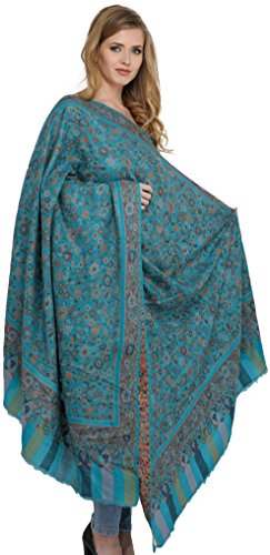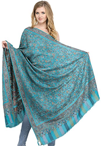 (Exotic India)/Accessories/Scarves/DIRECT FROM USA/Exotic India Blue-Bird Kani Pashmina Shawl from Amritsar with Woven Leaves