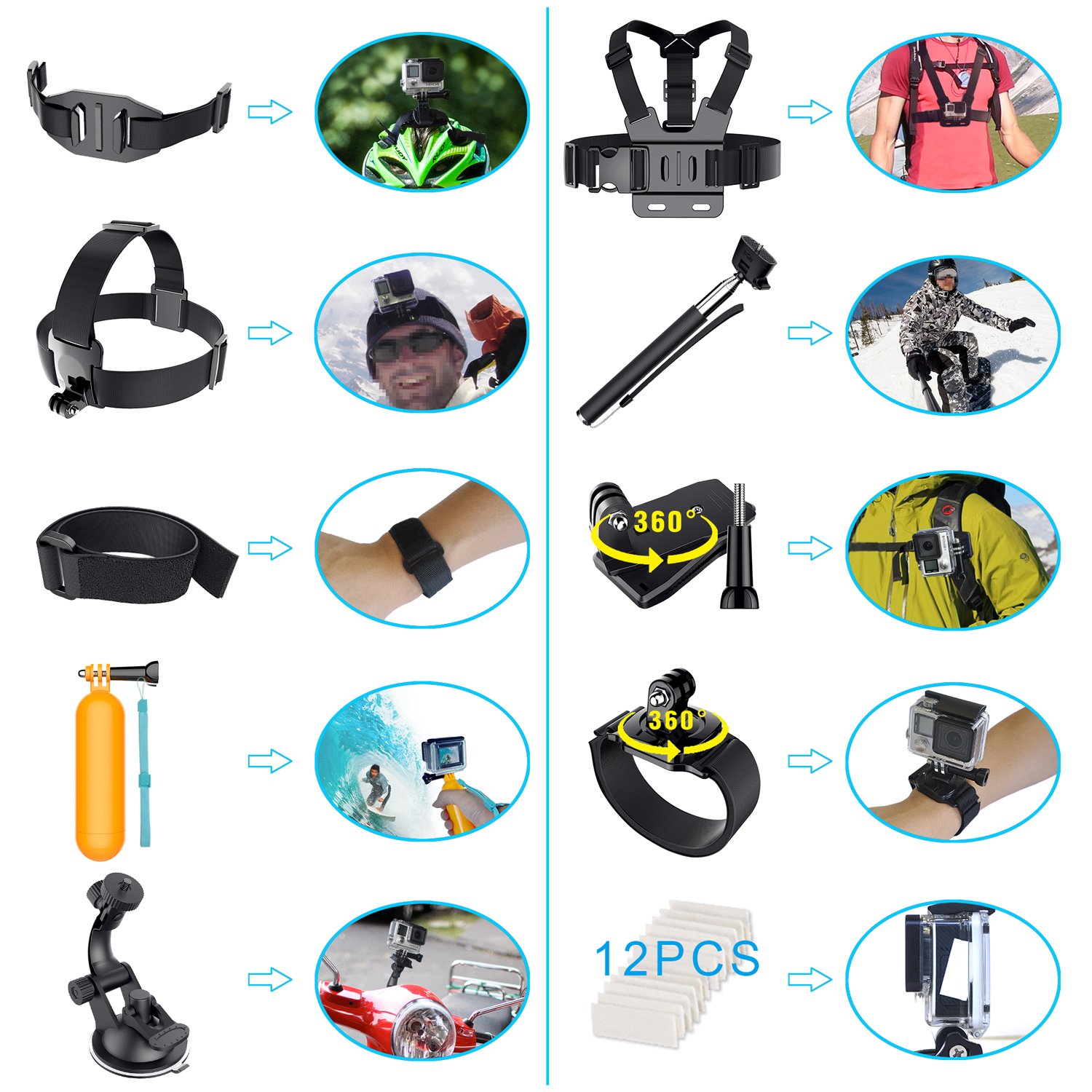 It connects to GOPRO camera chest strap, helmet strap, helmet, video stand, and various fixed attachment fixed mounts.