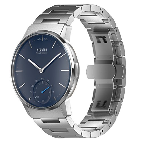 -. Feature : Quartz Analog Smartwatch - Stylish design with 40mm superb 316L stainless steel case and watch band, sapphire dial window, luminous hands/hour markers, and Switzerland gear box. / Activity Tracking - Built-in fitness tracker tracks your everyday accomplishments including steps, distance, and calories burned; remind you the phone calls and messages with vibration and flash. / Health Notification - Heart rate monitoring and sedentary reminder; track your sleep duration and quality; automatic time and date adjustment between different time zones. / 164FT/50M Waterproof - Support hands/face washing, sweating, raining, even swimming and bath in cold water. But don't press any buttons underwater and keep it away from STEAM and HOT WATER. / No Charging Needed - Up to 8 months long battery life(based on actual use) with a CR2430 button cell; Compatible with phones running Android 4.3+ or iOS 7.0+. Download Newatch APP from Apple Store or Google Play.