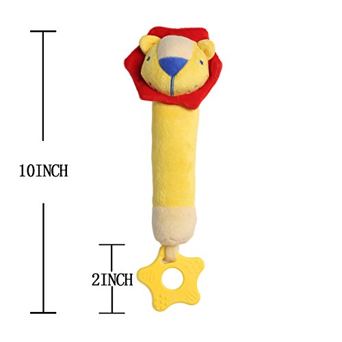 The medium sized handhold part is suitable for grasp, it makes fantastic sound when pinch, teether multiple teething surfaces to aid in the eruption of new teeth, which promotes the growth and development