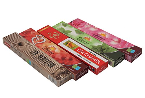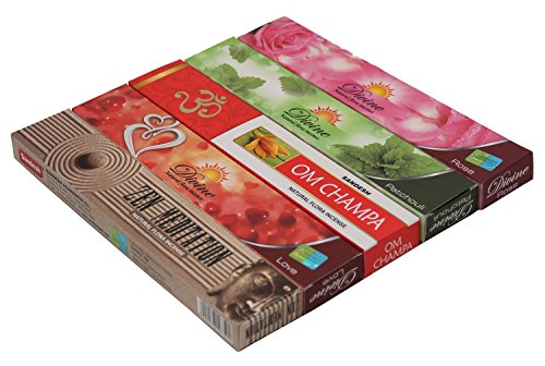 Gift Set of 5 Om Champa Love Patchouli Rose and Zen Meditation Incense Kit (Set Includes Incense Burner)