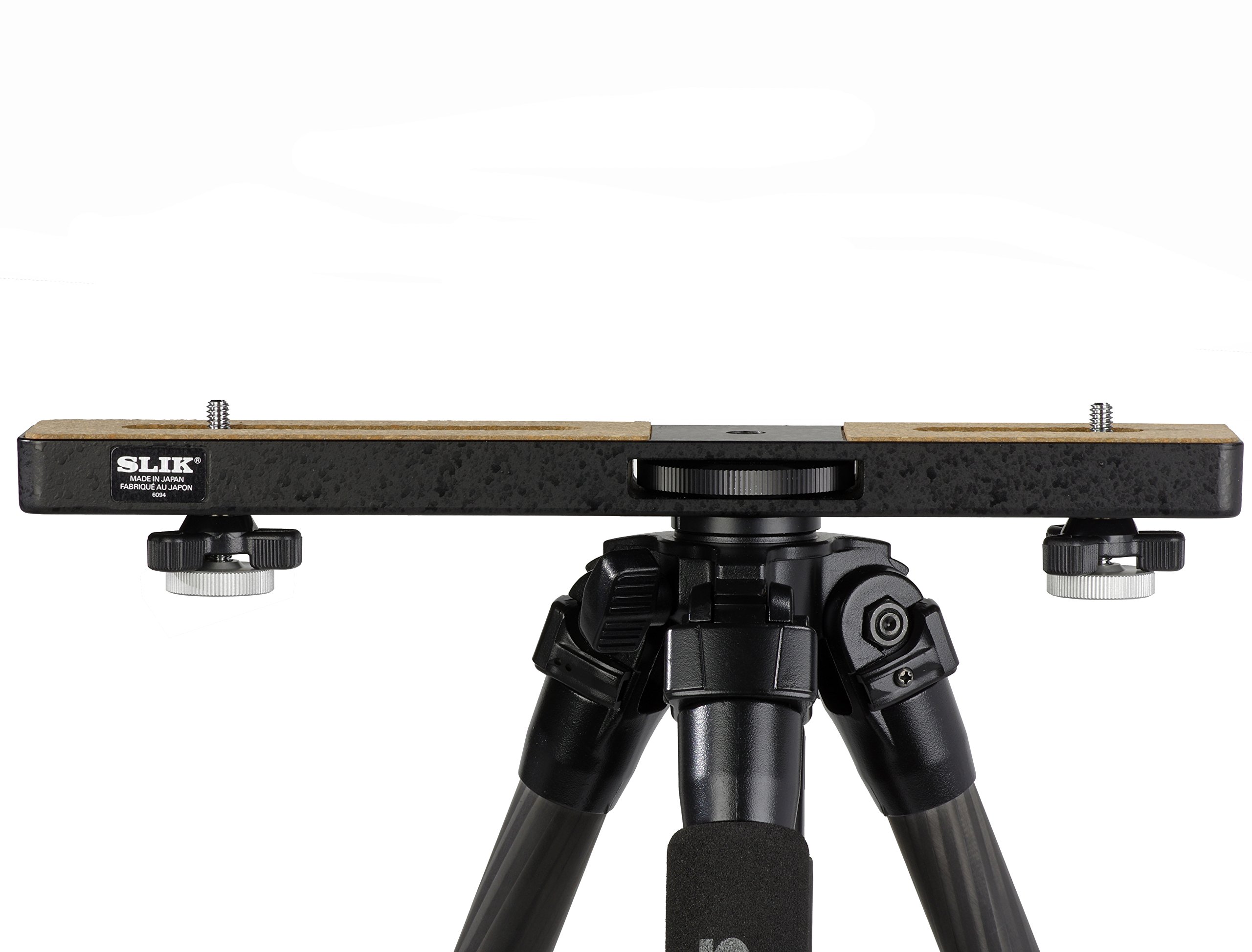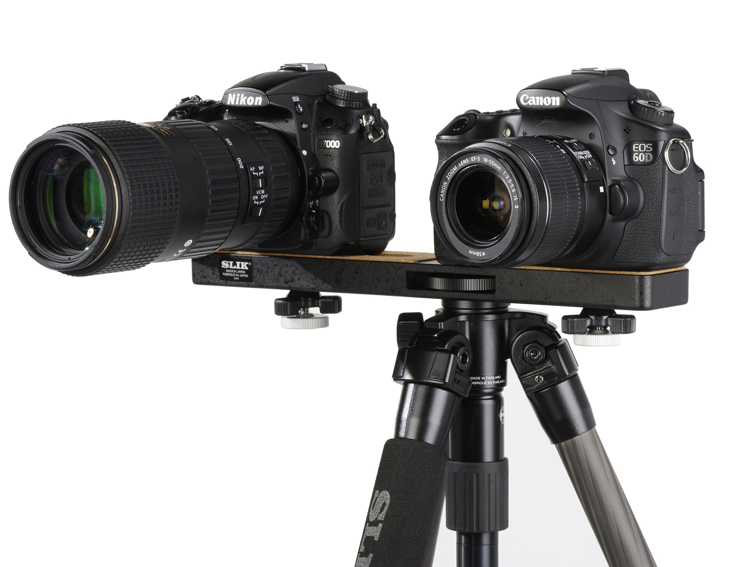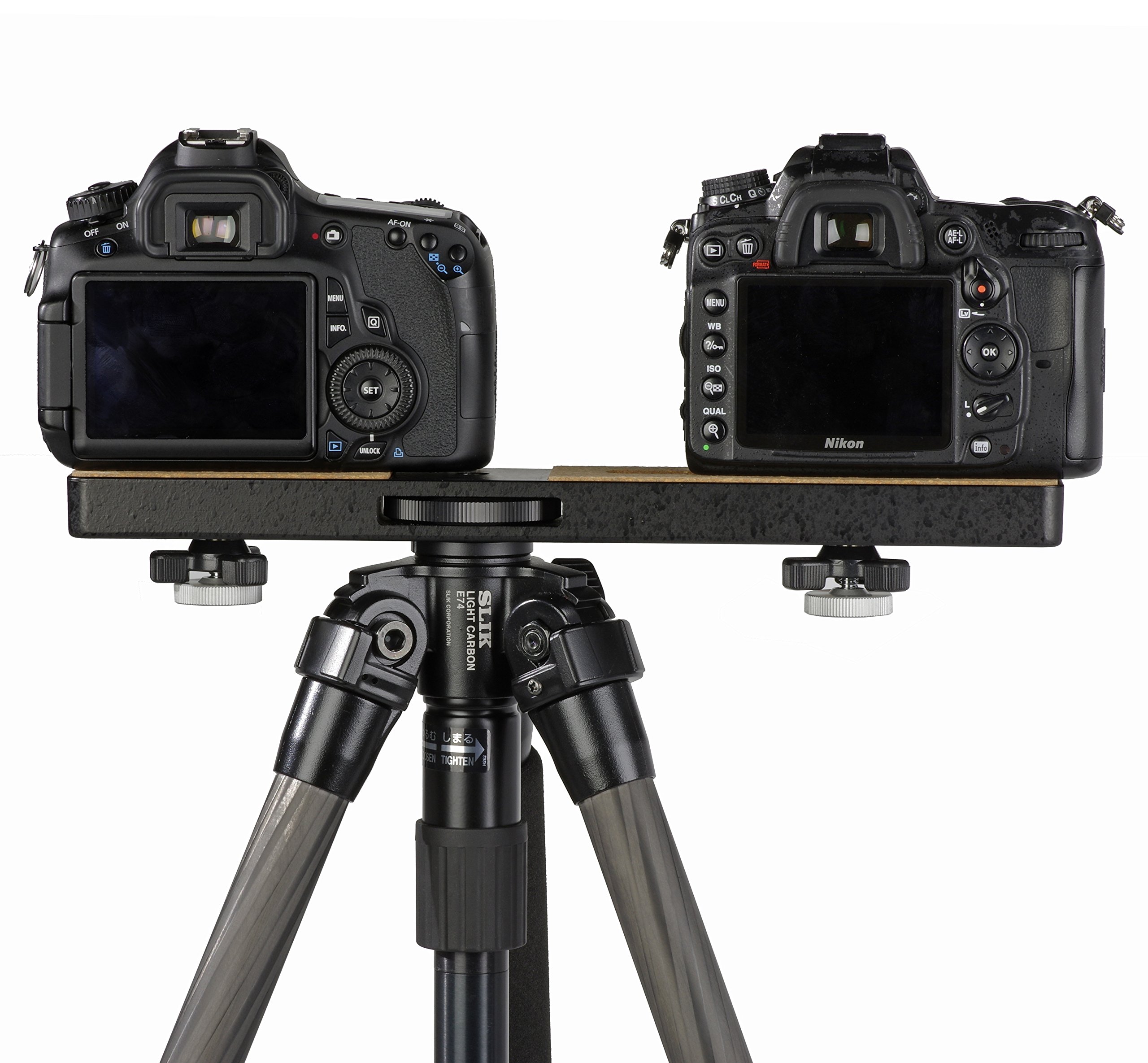 Main tripod mounting screws are not installed in the center so that two different cameras with different weights such as "camera with telephoto lens and camera with wide angle lens" can be mounted and balanced.