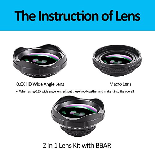 Packing List 1 X wide angle lens 1 X macro lens 1 X fisheye lens 1 X cleaning cloth 1 X clip 2 X lens cap 1 X selfie stick 1 X bluetooth remote shutter (with lanyard) 1 X manual 1 X carrying case