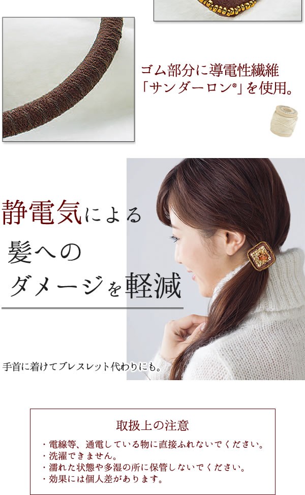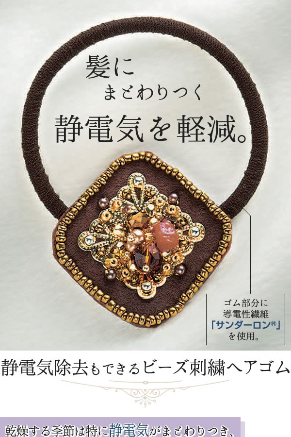 | 髪にダメージを与えるといわれている静電気を軽減!導電性繊維「サンダーロン(R)」でつくられたオシャレなヘアゴム。秋冬にぴったりのビーズ刺繍とフェルト生地のモチーフが上品。 |