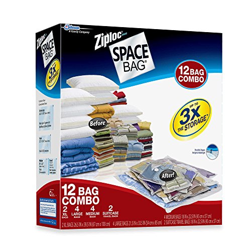 Studio : Ziploc Publisher : Ziploc Binding : Kitchen Product Description Ziploc brand Space Bags can provide up to 3 times the storage space! Pack contains 12 Vacuum Seal Bags in the most popular sizes. This pack comes with 2 XL bags, 4 Large bags, 4 Medium bags, and 2 suitcase travel bags. All bags are reuseable, airtight and offer water-tight protection. 0