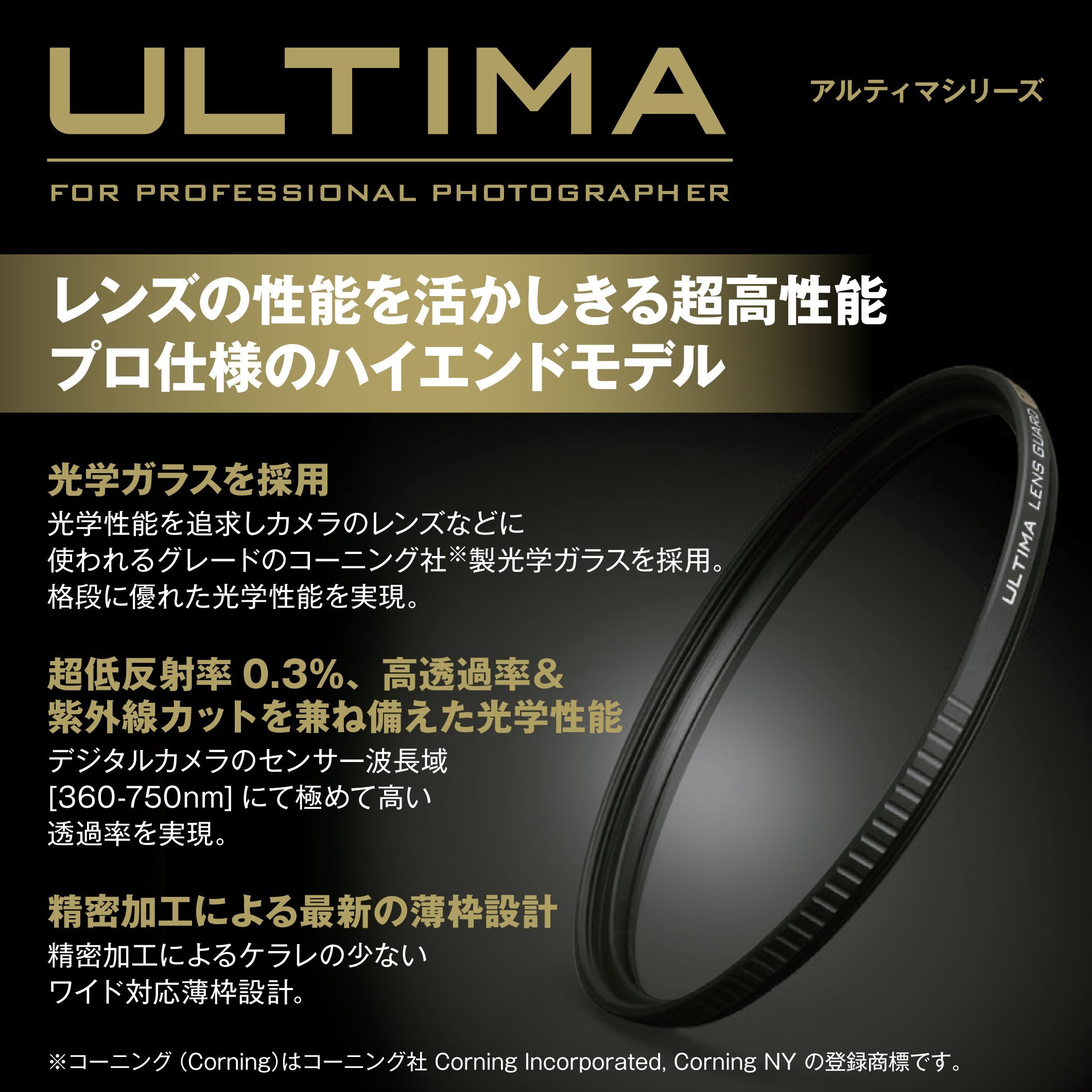 "ULTIMA (Ultima)" adopts the optical glass of Corning * as a glass material, and by applying high precision coating on both sides, it has high transmittance in wide band and